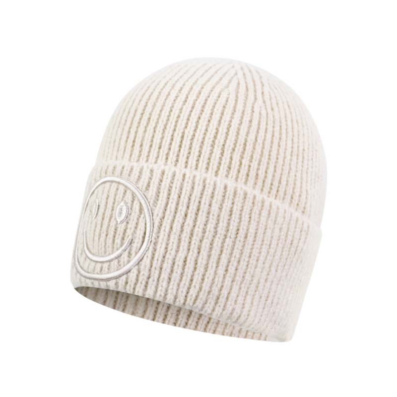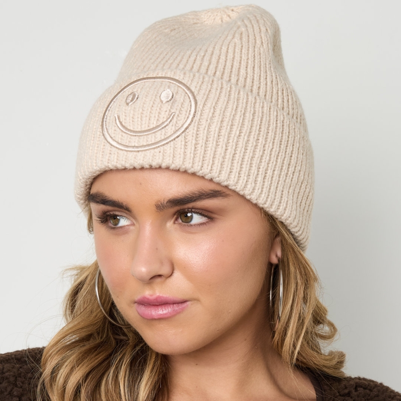 De beanie is in effen kleur met een smiley in dezelfde kleur.