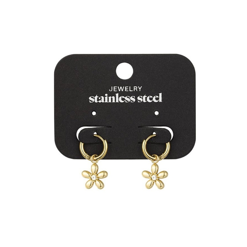 Oorringen met bloemtje in goud steel. Fijne oorringetjes van stainless steel die niet verkleuren met in het hart van de bloem een strass steentje. De oorbellen zijn hypo allergeen materiaal, dus iedereen kan ze dragen zonder irritatie of allergie te veroorzaken.