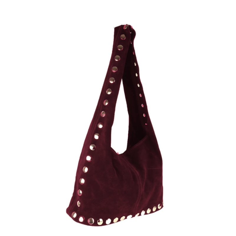 Trendy suède hobo tas met goudkleurige studs. Zacht, ruim en elegant met een stoer randje.
