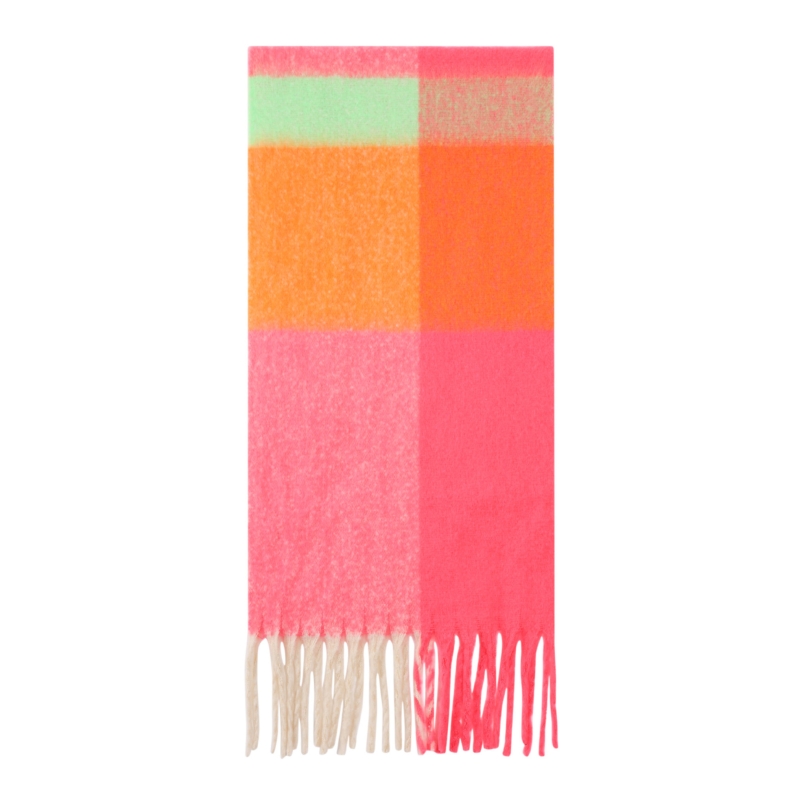 Deze sjaal heeft een mooi wollig effect. De sjaal heeft een patroon van blokken in verschillende tinten Roze en Oranje. Het materiaal van de sjaal is van 100% polyester en de afmeting is 180 cm x 50 cm.