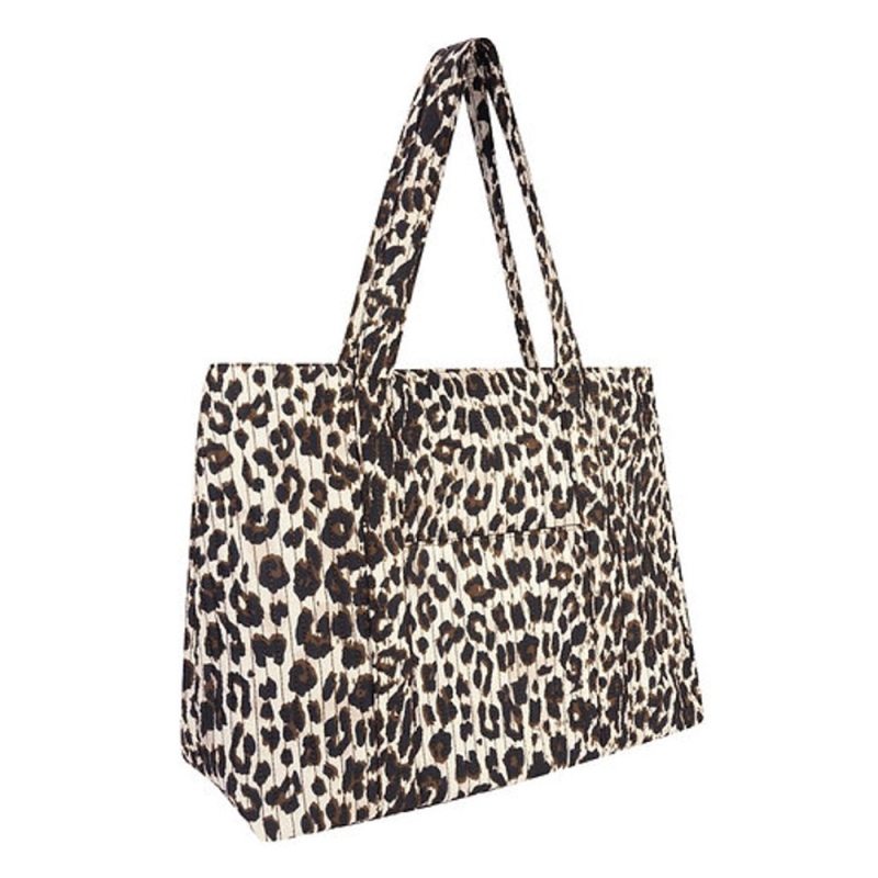 Gewatteerde tote-bag in luipaardprint shopper. De tas is zacht gewatteerd en heeft een groot vak met ritssluiting waar gemakkelijk een 15" laptop in past. Aan één buitenzijde zit een kleiner, open vak, handig voor een flesje of boekje. Aan de binnenzijde is nog een binnenvak met rits voor een portemonnee of telefoon. De binnenzijde is volledig zwart gevoerd.